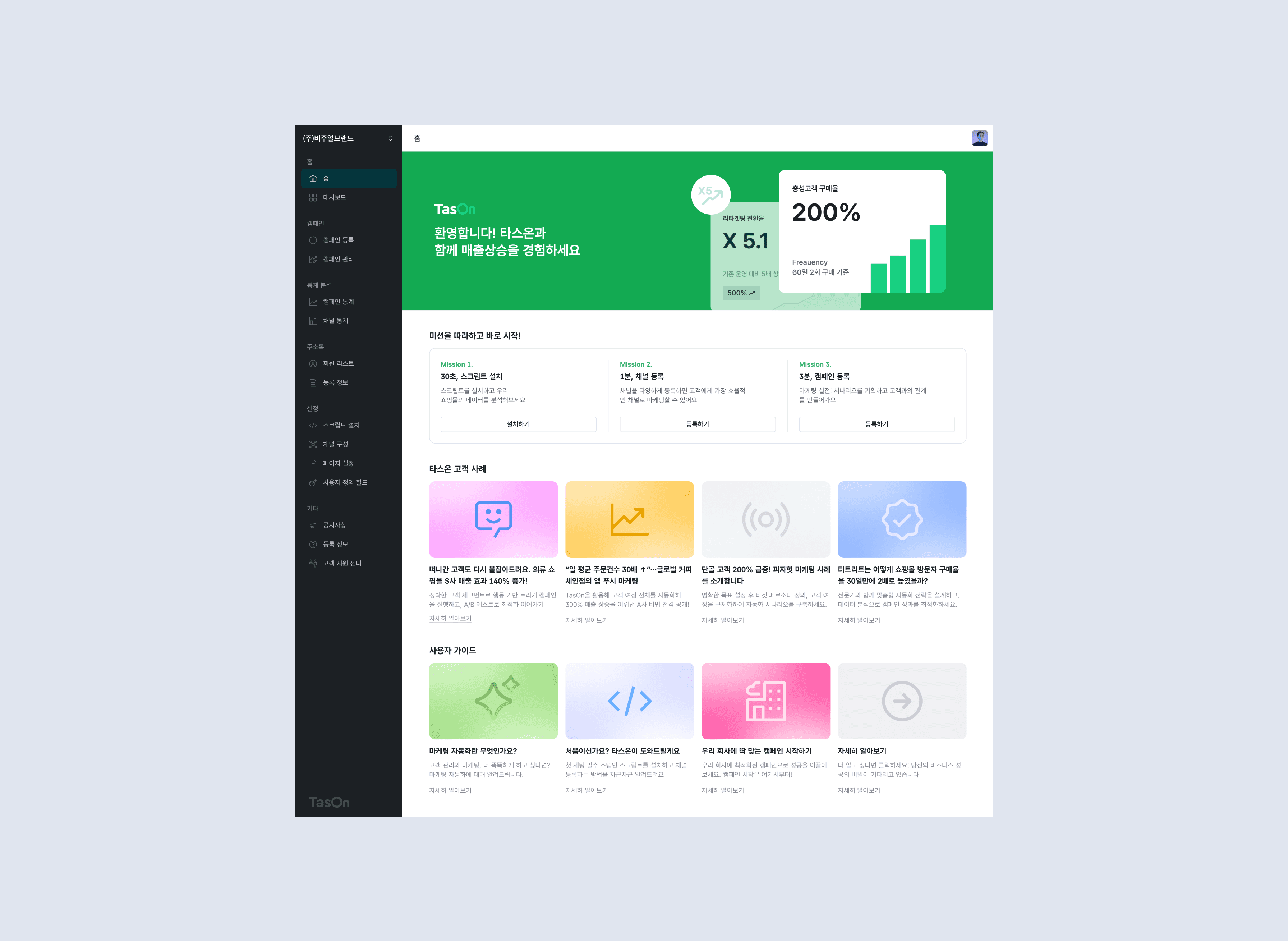 타스온의 가치를 한눈에 전달할 수 있도록 직관적이고 세련된 디자인으로 설계되었으며, 서비스의 주요 기능과 고객 성공 사례를 효과적으로 시각화하여 방문자들이 타스온의 강점을 빠르게 이해하고 신뢰할 수 있도록 구성했습니다.